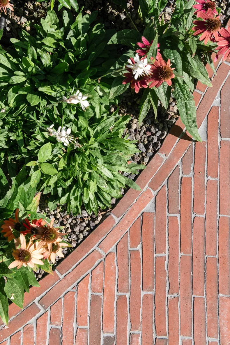 De levende lijnen van de Elegantia, die geen perfecte rechte lijn vormen, spraken ons ten zeerste aan. Het is een unieke klinker, en we waren enthousiast dat de klant deze klinker ook in zijn tuin wilde. De kleiklinker droeg bij aan het algemene idee van het project door rust en eenvoud te brengen, passend bij de donkergrijze kleur van de gevel. We speelden lang met de olijfkleurige klinker, maar kozen uiteindelijk voor de rood-bordeaux kleuren.