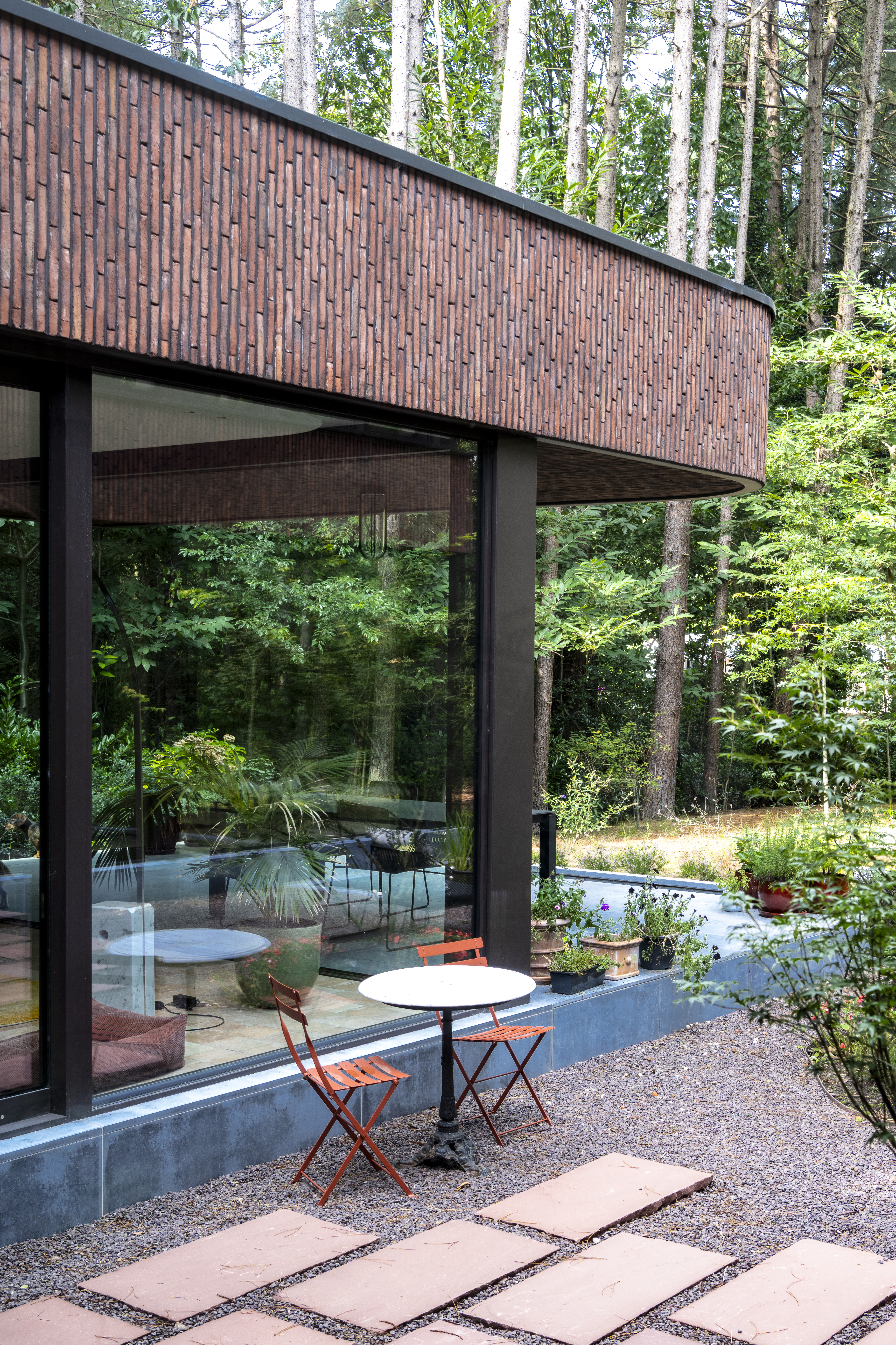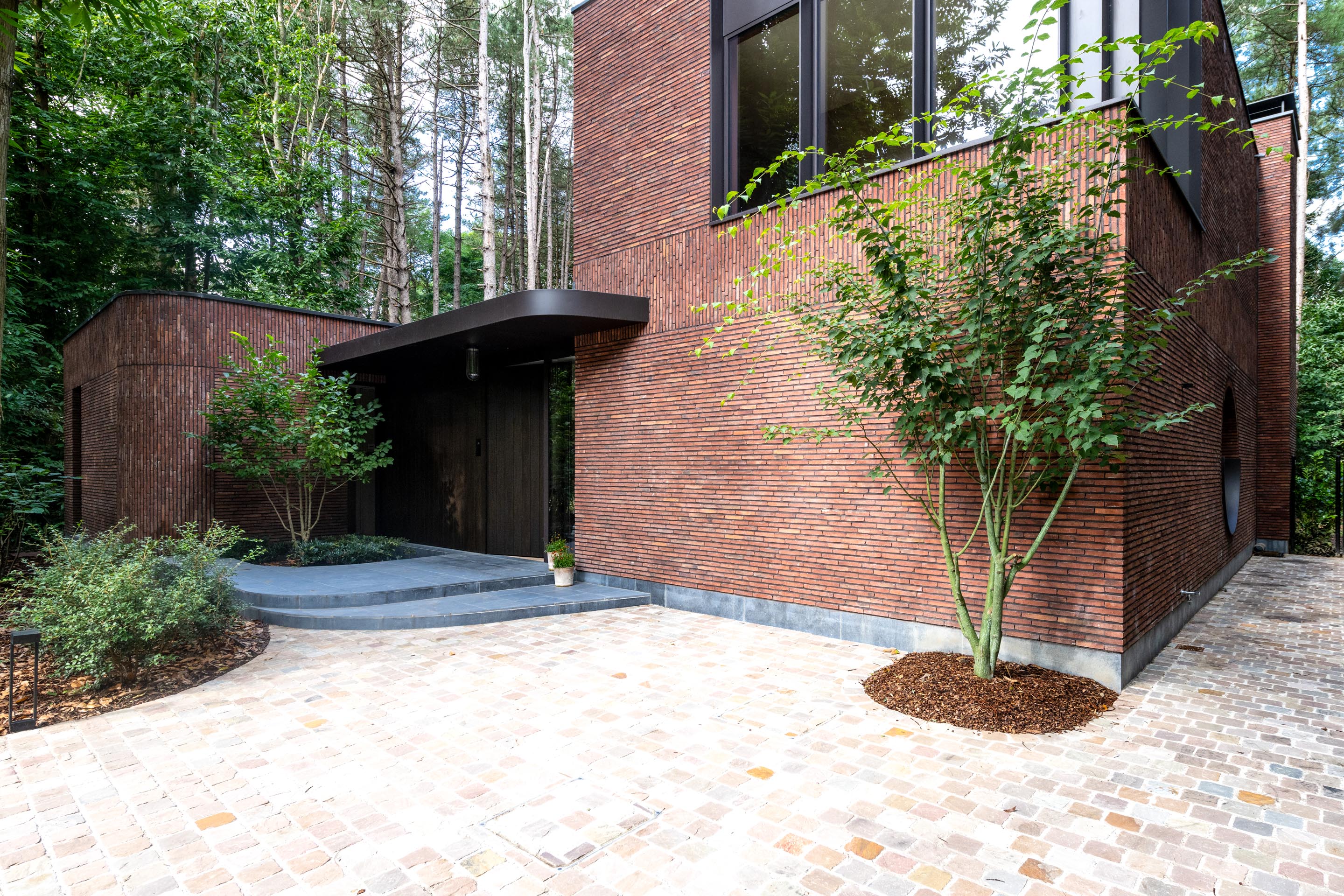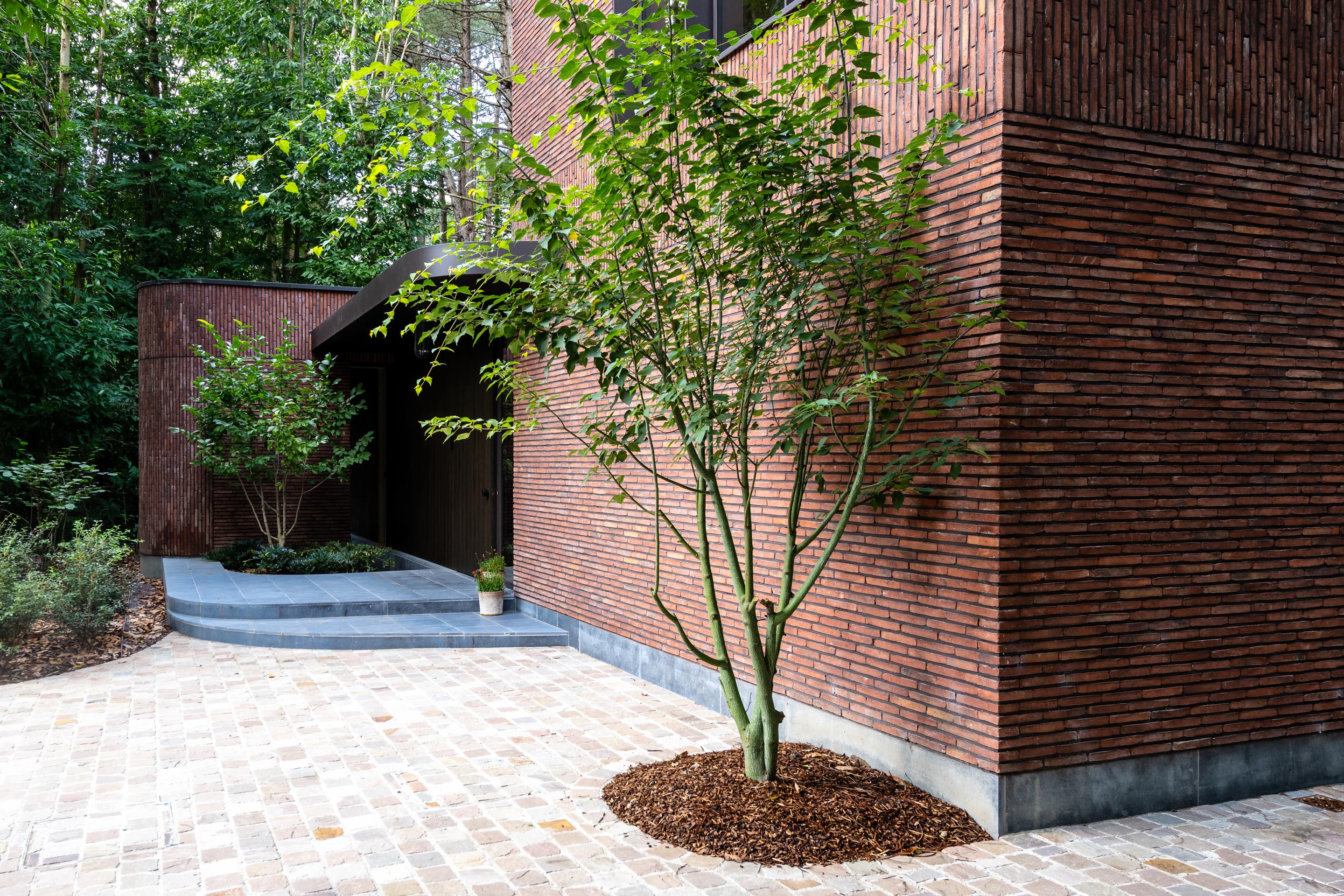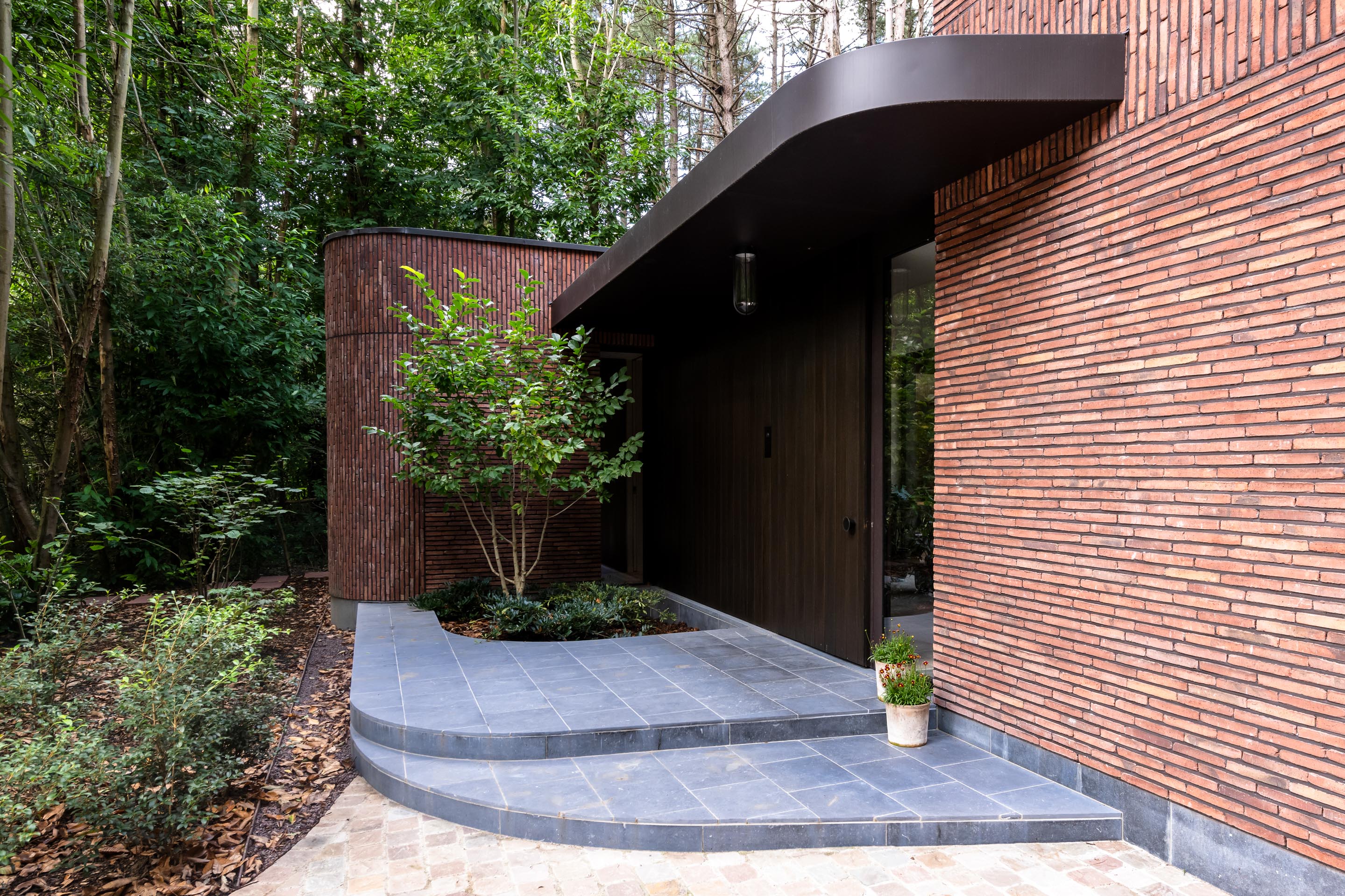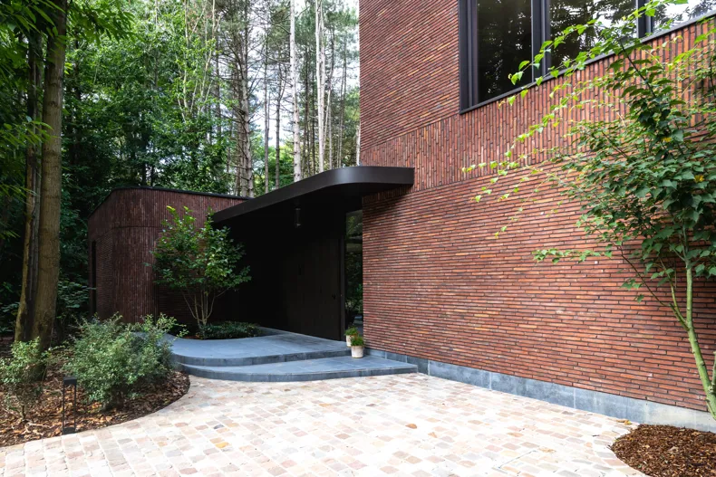 Het exterieur van de woning wordt gekenmerkt door het gebruik van de terracottakleurige, langwerpige gevelsteen linea7 3016. Deze keuze blijkt geen toeval, maar een zorgvuldig afgewogen ingreep. De rode slanke baksteen, gecombineerd met een diep terugliggende donkerbruine voeg, zorgt voor een warme, aardse uitstraling die perfect aansluit bij de natuurlijke omgeving. Dankzij de artisanale productietechniek van deze Hand-Made gevelsteen heeft deze sterke en natuurlijke kleurnuances. Samen met de textuur contrasteert de gevelsteen op elegante wijze met de strakke architecturale lijnvoering. Verticale speklagen en fijn afgewerkte stootvoegen brengen een ritmisch reliëf aan in de gevels, terwijl ook onder de luifel steenstrips werden toegepast. Dit creëert een monumentaal effect dat rust en diepte uitstraalt.