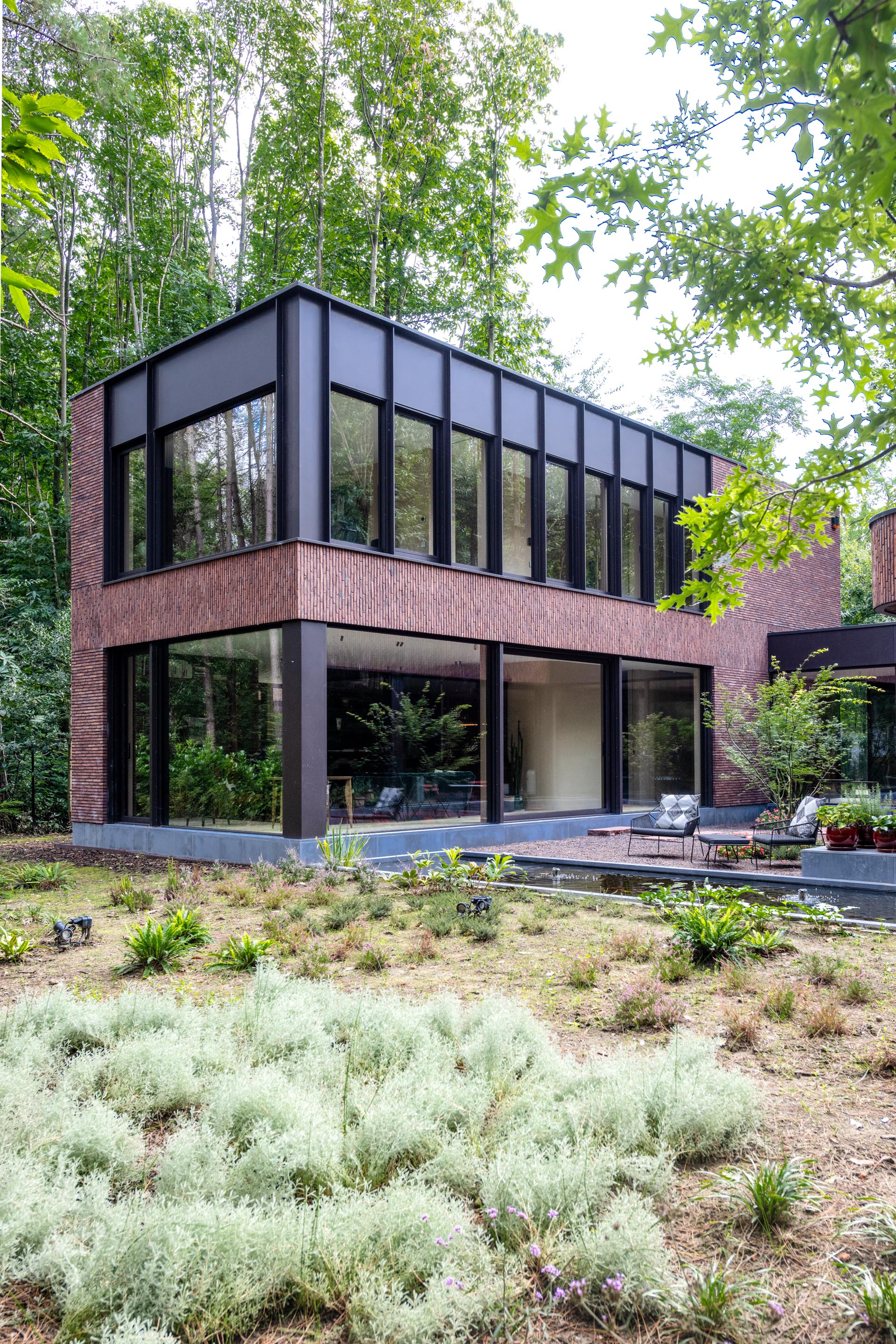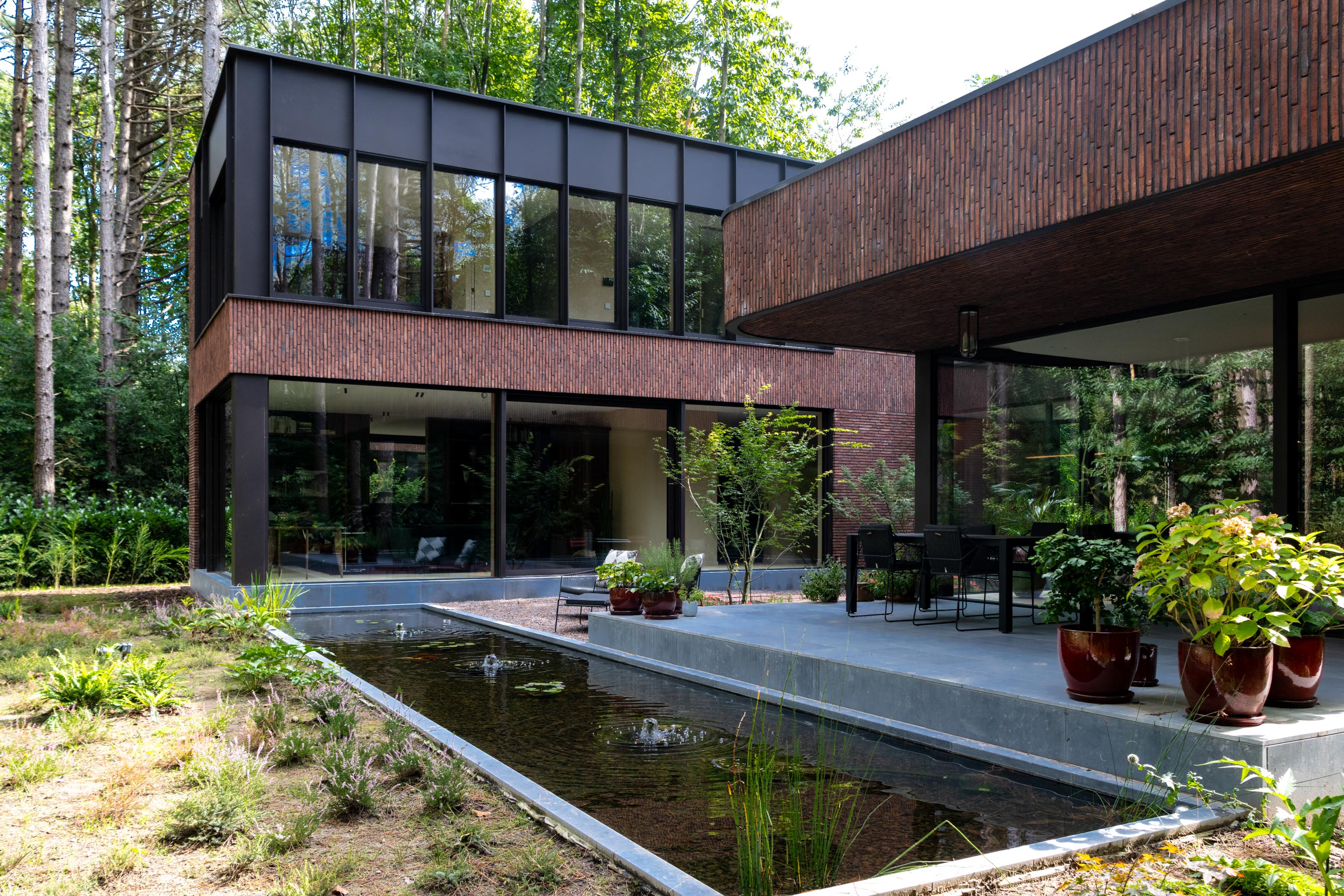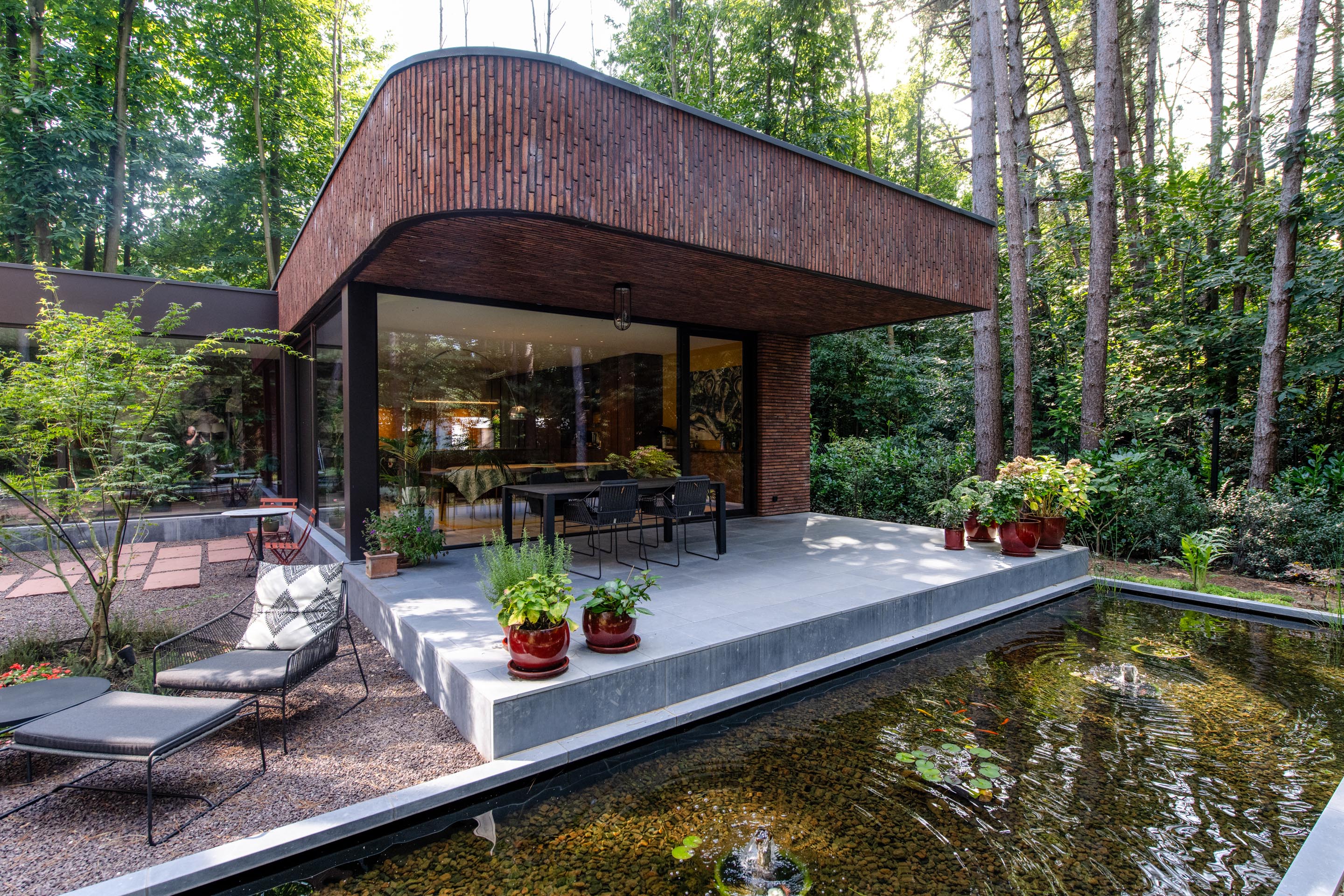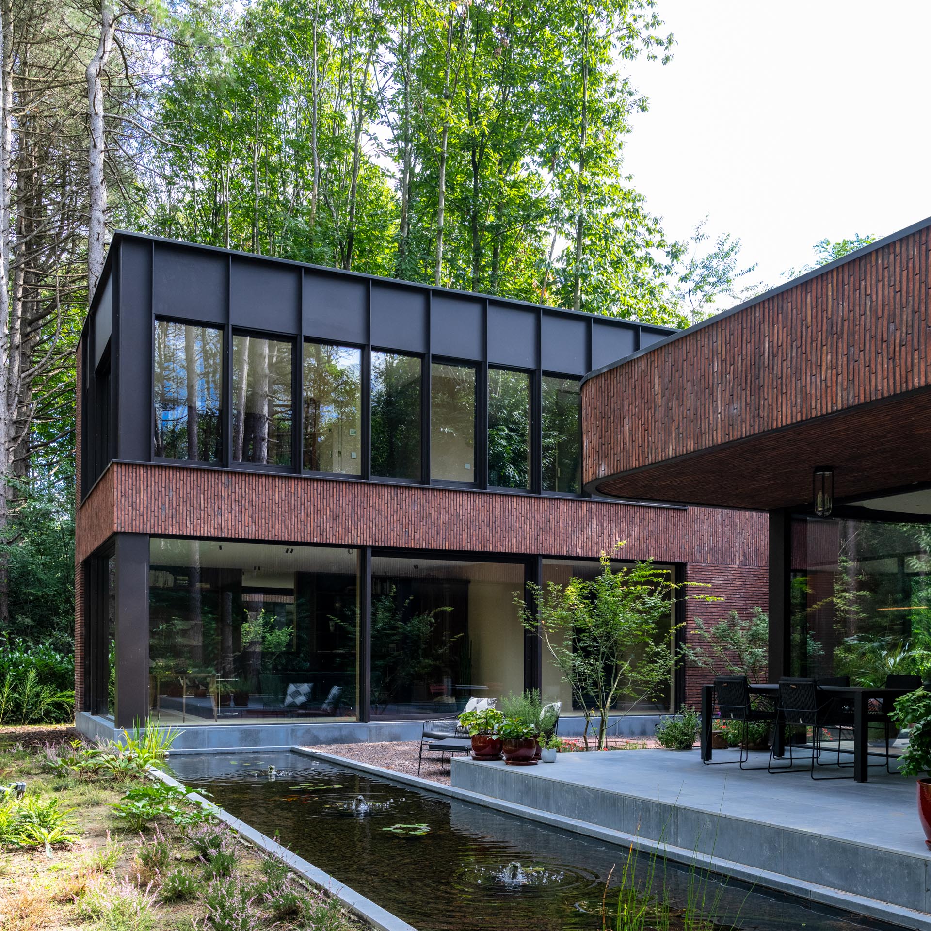 De woning nestelt zich in het groene decor van een uitgestrekt bosgebied. Die nabijheid van de natuur werd van bij het begin als essentiële inspiratiebron meegenomen. De bewoners koesterden de wens naar een huis dat een onmiskenbare relatie aangaat met het landschap, zonder in te boeten aan persoonlijke expressie. Het antwoord op die ambitie vinden we in een uitgesproken U-vormige planstructuur rond een centraal gelegen patio. Deze binnentuin met waterpartij vormt niet enkel het visuele en functionele hart van de woning, maar fungeert ook als een serene overgangsruimte tussen het interieur en het omliggende bos.