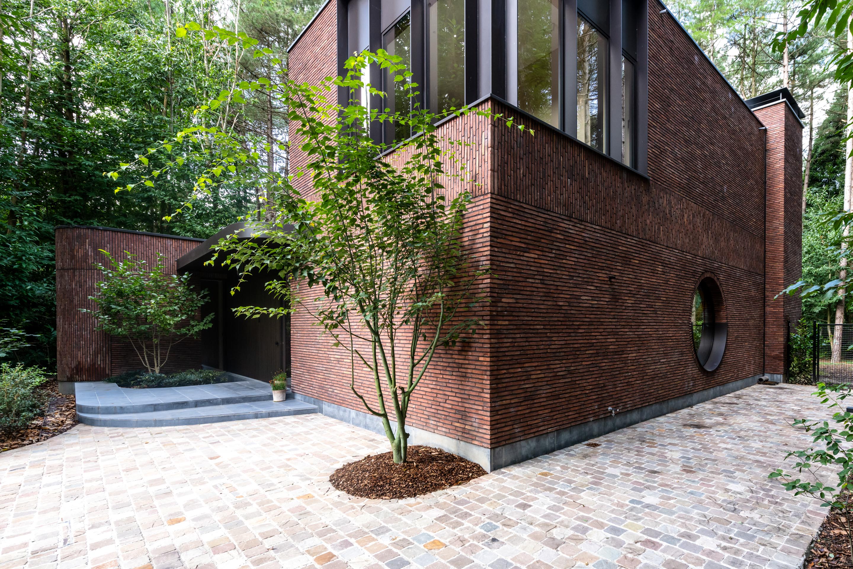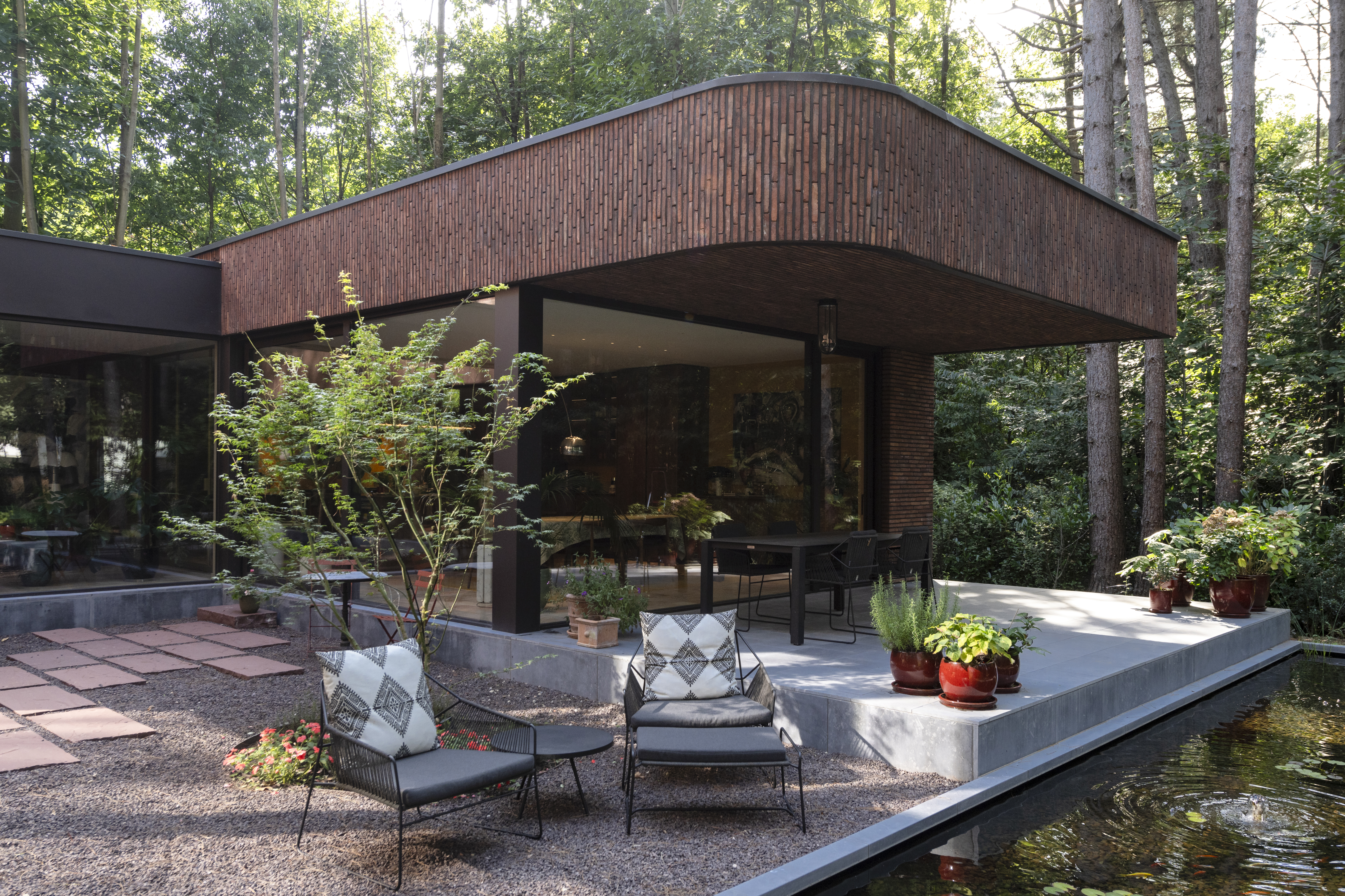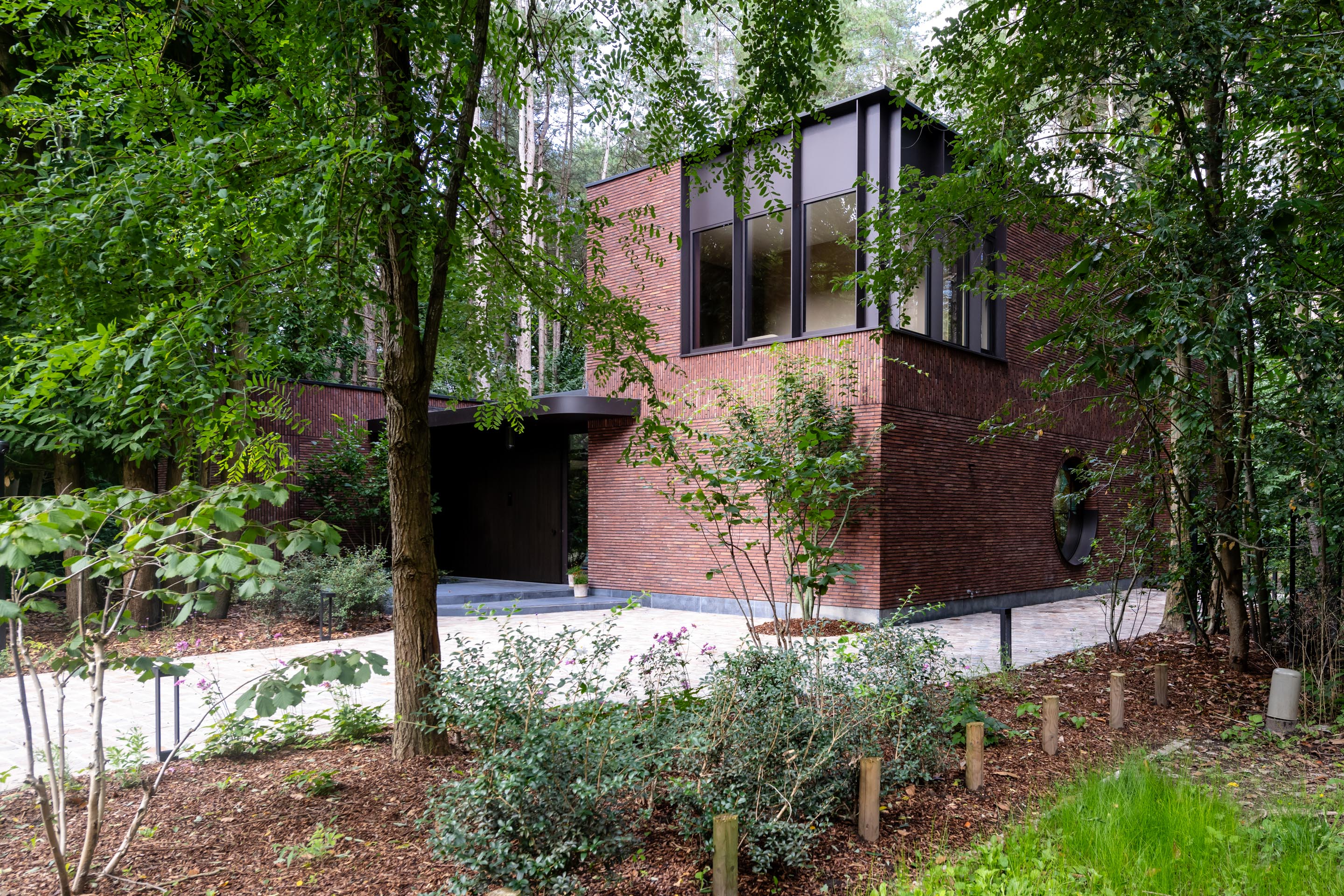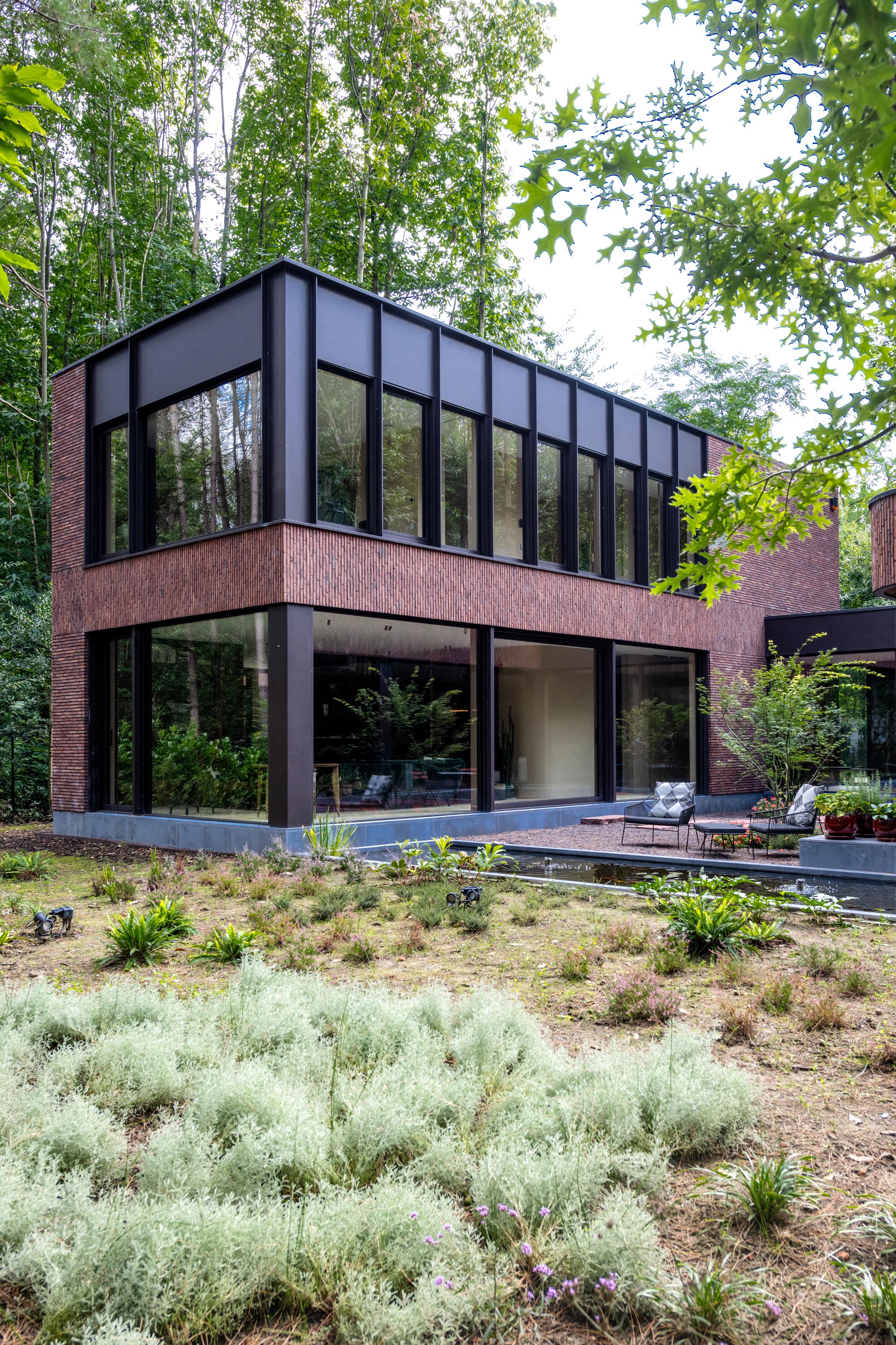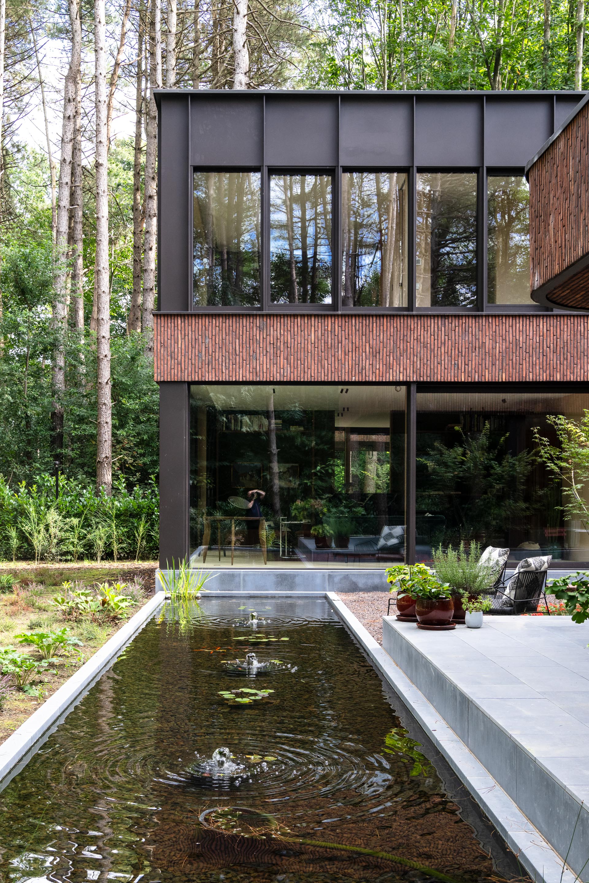 De woning nestelt zich in het groene decor van een uitgestrekt bosgebied. Die nabijheid van de natuur werd van bij het begin als essentiële inspiratiebron meegenomen. De bewoners koesterden de wens naar een huis dat een onmiskenbare relatie aangaat met het landschap, zonder in te boeten aan persoonlijke expressie. Het antwoord op die ambitie vinden we in een uitgesproken U-vormige planstructuur rond een centraal gelegen patio. Deze binnentuin met waterpartij vormt niet enkel het visuele en functionele hart van de woning, maar fungeert ook als een serene overgangsruimte tussen het interieur en het omliggende bos.