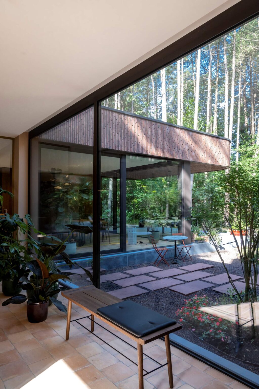 De gevel speelt niet alleen een hoofdrol aan de buitenkant, maar ook binnenin. Door het centrale patio-concept zijn de gevelstenen prominent zichtbaar vanuit verschillende binnenruimtes. Daardoor werd de keuze voor de linea7 7036 nog belangrijker: de warme kleurtonen en de fijne textuur vormen een natuurlijke verlenging van het interieur. De combinatie met de donker gebeitste houten voordeur, het matte donkerbruine buitenschrijnwerk en de doorlopende arduinen plint maakt het geheel krachtig en toch ingetogen.